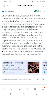 On October 30, 1993, a search and Rescue operation took place in Great Smoky Mountains National Park after a Cessna 421 aircraft carrying five people went missing. The missing plane had transmitted an emergency locator ping, prompting the search. A helicopter assisting the search crashed about a quarter mile from the top of Clingmans Dome on the Tennessee side. The helicopter’s rotors were ripped off during the crash, according to one witness. The search effort also involved part maintenance personnel assisting with traffic and cleanup. Ultimately, the Cessna 421 was found, and a later investigation attributed the crash to a fuel system malfunction.